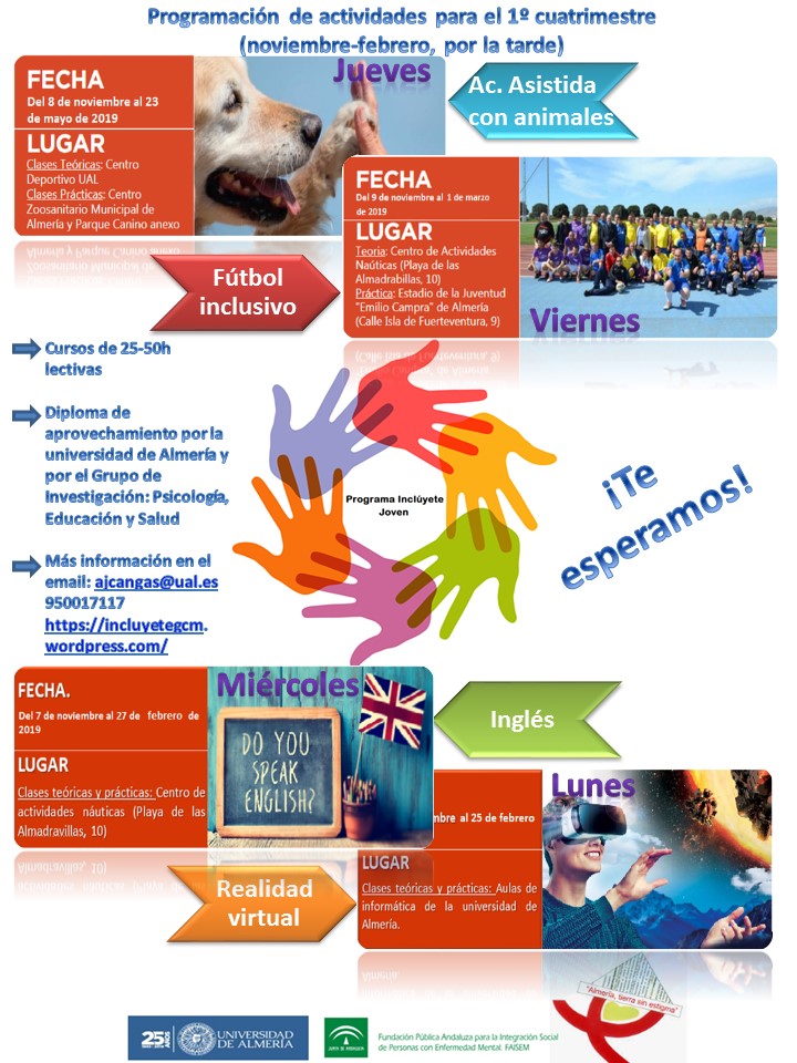 A través de la firma de un contrato de investigación y desarrollo entre la Universidad de Almería y la Fundación Pública Andaluza para la Integración Social de Personas con Enfermedad Mental. FAISEM, y la participación de la plataforma Almería, Tierra sin Estigma, se va a poner en marcha en Almería una experiencia pionera denominada Programa Inclúyete-Joven. Se trata de un programa formativo, donde comparten docencia estudiantes universitarios y jóvenes con problemas de salud mental (entre 16-26 años), en una ambiente inclusivo, con profesorado de la universidad y colaboradores de diferentes grupos de investigación, en los que no hace falta una titulación previa, sino el interés en participar y aprender nuevos conocimientos y práctica en materias relacionadas con la Actividad física asistida con animales, Fútbol, Inglés o Realidad virtual (que se impartirán en el primer cuatrimestre) y en Deportes náuticos, Baloncesto/kin-ball, Interpretación de la cultura mediterránea y Expresión literaria y medios audiovisuales (en el segundo).