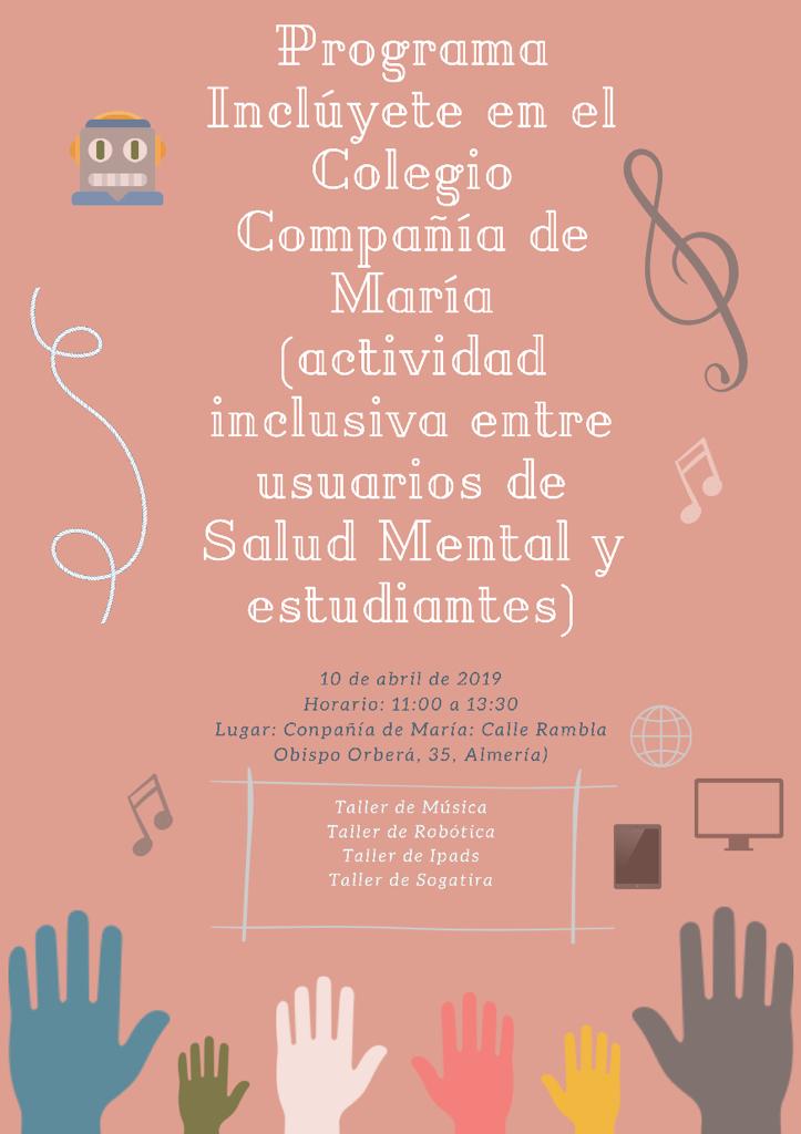 Dentro de esta programación, el próximo 10 de abril, se llevará a cabo el programa en el colegio Compañía de María de Almería, donde entre las 9:15-10:30 horas será la charla con usuarios y, después del descanso, se realizarán cuatro talleres compartidos, en esta ocasión de música, robótica, Ipads y oogatoria. El programa está abierto a la participación de cualquier personas interesada en la experiencia. Inclúyete!!!