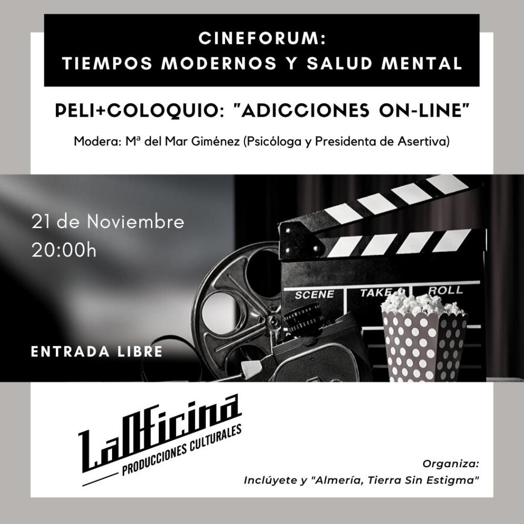 «Tiempos modernos y salud mental» es el nombre del cineforum que comienza el 21 de noviembre organizado desde el programa Inclúyete, en colaboración con el Consejo pro salud mental Almería, Tierra sin Estigma y LaOficina Produccciones Culturales, donde se abordarán temas de interés actual relacionados con la Psicología, más concretamente con la Salud Mental.