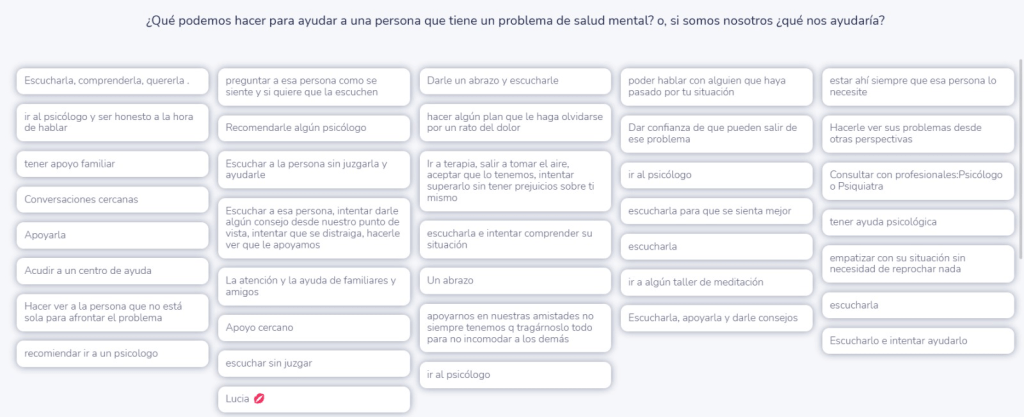 Ayer finalizamos una experiencia intensa de dos días, donde tuvimos la oportunidad de dialogar con los jóvenes qué es para ellos un problema de salud mental y qué podemos hacer para afrontarlos. Fueron dos jornadas de comentarios sobre diferentes maneras de entender la salud mental, de iniciativas y de dificultades. Nos quedamos con muchas cosas pensando. Nos gustaría compartir como reflexión final los comentarios que han hecho los estudiantes sobre lo que parece importante para ayudar a otros o a sí mismos para afrontar un problema de salud mental.