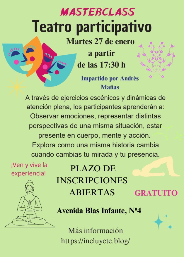 El martes 27 de enero, a partir de las 17:30 h, te proponemos una masterclass de teatro participativo y comunitario con Andrés Mañas, pensada para jóvenes de 14 a 25 años con ganas de moverse, expresarse y compartir.